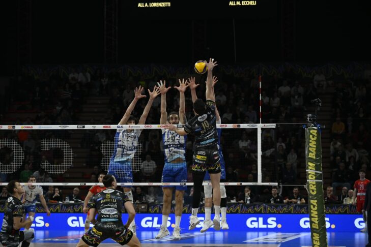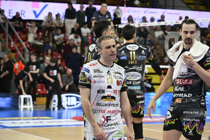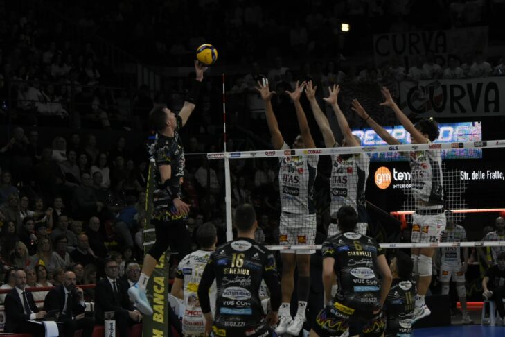 Il quarto set inizia con il servizio di Semeniuk e il punto di Frascio. Giannelli a due mani (1-1). Punto di Plotnytskyi. Bella diagonale stretta di Frascio. 3-2 e c’è l’ace di capitan Giannelli. Invasione di Monza (4-2). 5-2 muro di Mosca. Spike di Ben Tara. 6-4 ancora l’attacco di Ben Tara. Bell’azione di Semeniuk. Palla veloce di Rohrs. 8-6 parallela di Ben Tara. Scambio lungo chiuso dal primo tempo di Russo. Coach Eccheli chiama il time out. Punto di Frascio. Pallonetto di Russo (11-7). Pipe di Semeniuk. Primo tempo di Russo. Spike di Plotnytskyi. Time out Monza. Battuta in rete per Semeniuk. La butta giù Plotnytskyi (15-8). Punto Monza. Solè trova il mani out degli avversari. Muro di Monza su Ben Tara. Diagonale di Plotnytskyi (17-10). Recupera Frascio, poi la battuta in rete (18-11). Primo tempo di Beretta. Diagonale di Atanasov. Azione di Ben Tara (19-13). Rete. Out di Perugia. Errore in attacco di Ben Tara. Anche per Atanasov, ma viene chiesto il videocheck per ipotetico tocco: non c’è (20-16). Semeniuk in battuta. Plotnytskyi a due mani (21-16). Ace di Semeniuk, poi la pipe (23-16). Battuta in rete per lui (23-16). Primo tempo di Russo, set point (24-17). Entra Dzavoronok in battuta. La chiude il capitano a due mani (25-17).